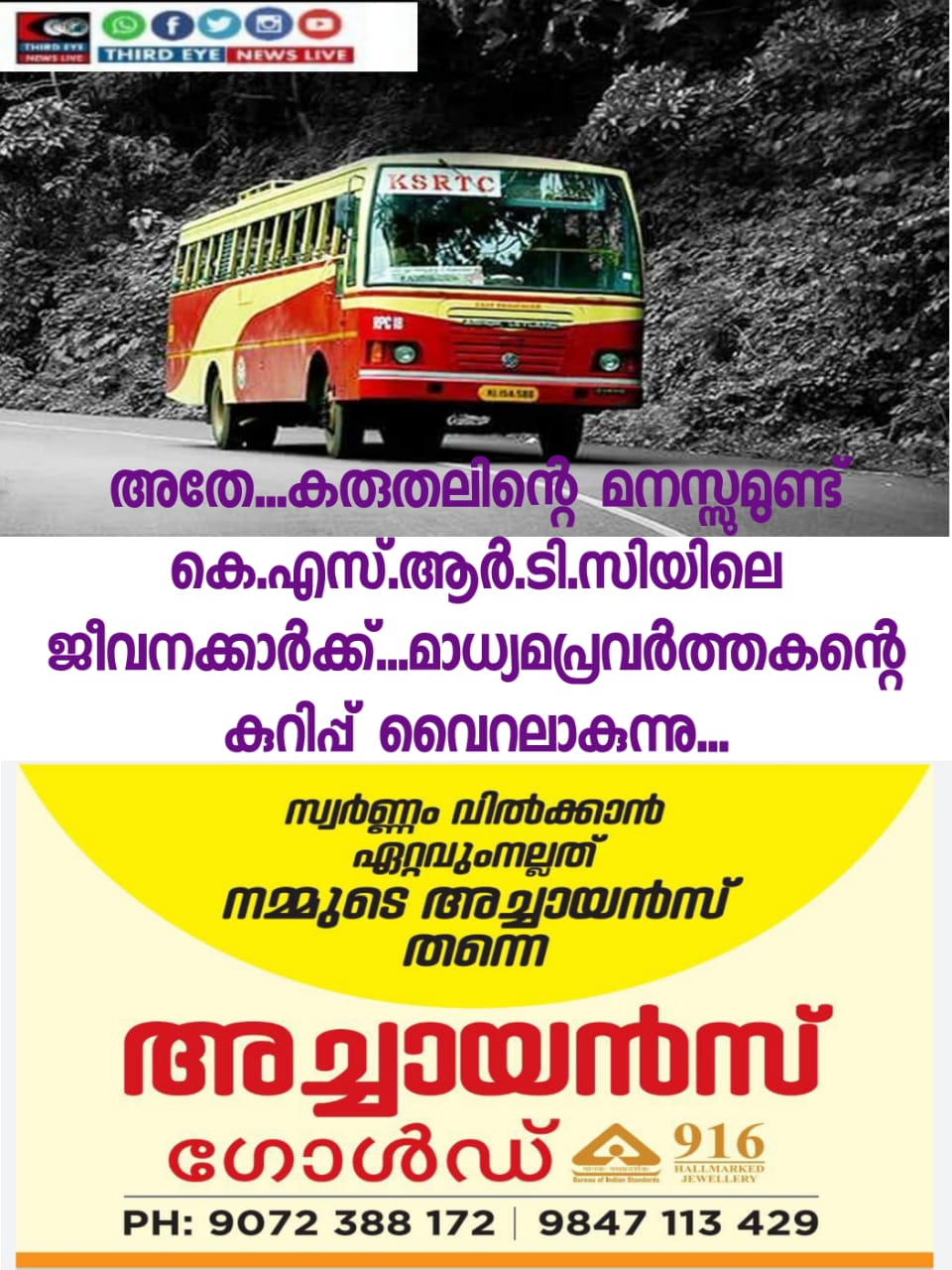 പറഞ്ഞ് വന്നത് മറ്റൊന്നുമല്ല. അവരുടെ കരുതലും സ്നേഹവും കണ്ടപ്പോൾ മറ്റ് ചിലരെ ഓർമ്മ വന്നു..വിദ്യാർത്ഥിനിയുടെ മുന്നിലിട്ട് സ്വന്തം അച്ഛനെ പട്ടിയേപ്പോലെ തല്ലിച്ചതച്ച കാട്ടാക്കട ഡിപ്പോയിലെ അവരുടെ തന്നെ സഹപ്രവർത്തകരെ.. പിന്നെ,