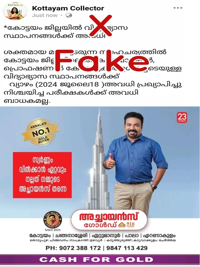 ഇന്ന് കോട്ടയത്തെ സ്കൂളുകൾക്ക് അവധിയില്ല ഗയ്സ്; അവധിയുണ്ടെന്ന് ജില്ലാ കളക്ടറുടെ പേരിൽ വ്യാജ സന്ദേശം; വ്യാജ വാർത്ത പ്രചരിപ്പിക്കുന്നവർക്കെതിരെ നടപടിയെന്ന് ജില്ലാ കളക്ടർ