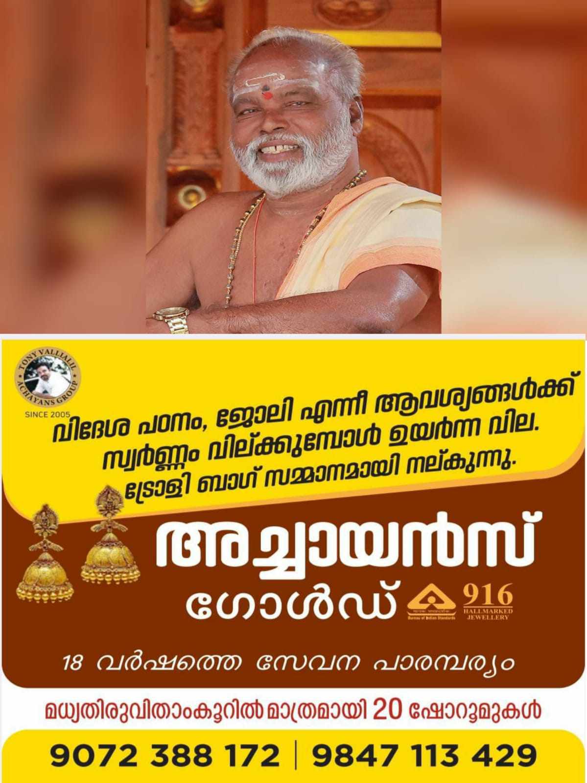 കോട്ടയം : താന്ത്രിക മേഖലയിൽ അരനൂറ്റാണ്ട് പിന്നിട്ട കുമരകം ഗോപാലൻ തന്ത്രിക്ക് ശിഷ്യഗണങ്ങൾ നൽകുന്ന ആദരവ് ഇന്ന് നാഗമ്പടം ശ്രീ മഹാദേവക്ഷേത്ര സന്നിധിയിൽ നടക്കും.