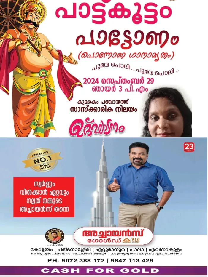 ഭാഗമായി 29ന് ഞായറാഴ്ച 3:00 മണിക്ക് കുമരകം പഞ്ചായത്ത് സാംസ്കാരിക നിലയത്തിൽ പാട്ടോണം എന്ന പേരിൽ പാട്ട്കൂട്ടം സംഘടിപ്പിക്കും.