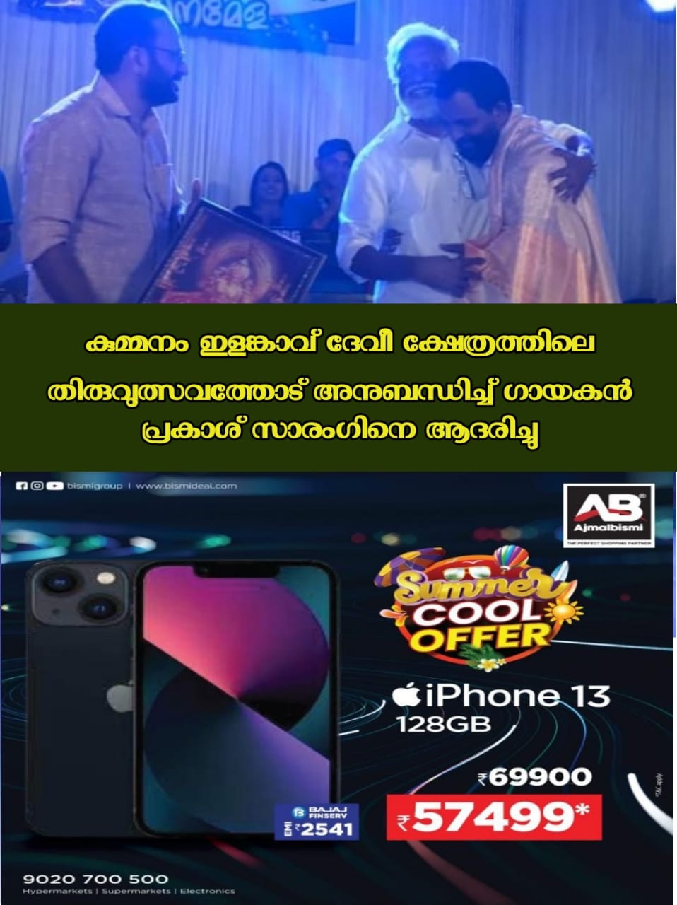 കുമ്മനം: ഇളങ്കാവ് ദേവീ ക്ഷേത്രത്തിലെ തിരുവുത്സവത്തോട് അനുബന്ധിച്ച് പ്രശസ്തമായ മാളികപ്പുറം മലയാളം സിനിമയിലെ ഹരിവരാസനം എന്ന ഗാനത്തിലൂടെ ശ്രദ്ധേയമായ പ്രകാശ് സാരംഗ് നെ മുൻ മിസോറാം ഗവർണർ കുമ്മനം രാജശേഖരൻ ആദരിക്കുന്നു. പ്രസിഡന്റ് മധുസൂദനൻ, വഴയ്കാറ്റ് സമീപം