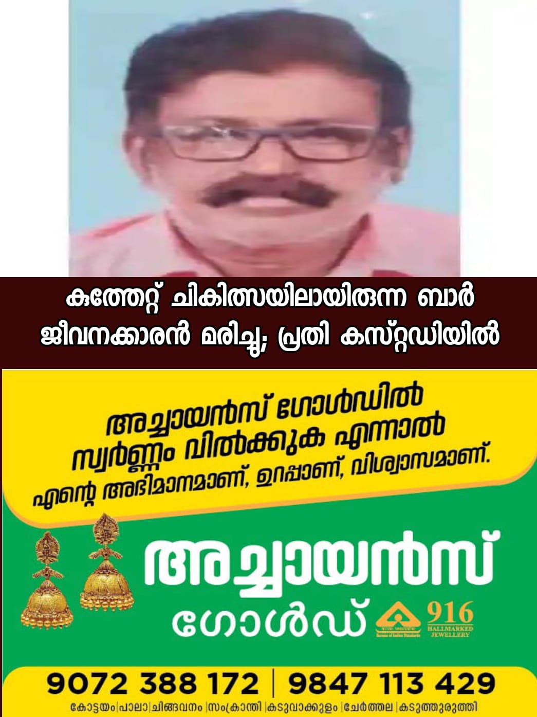കുത്തേറ്റ് ചികിത്സയിലായിരുന്ന ബാര് ജീവനക്കാരന് മരിച്ചു; പ്രതി കസ്റ്റഡിയില്