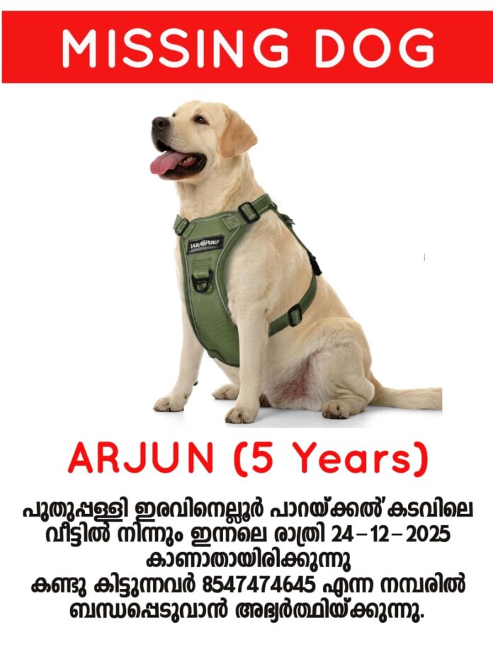 ഇന്നലെ( 24-12-2025)രാത്രി വീട്ടിൽ നിന്നുമാണ് വൈറ്റ് കളറുള്ള ലാബിനെയാണ് കാണാതായത്.