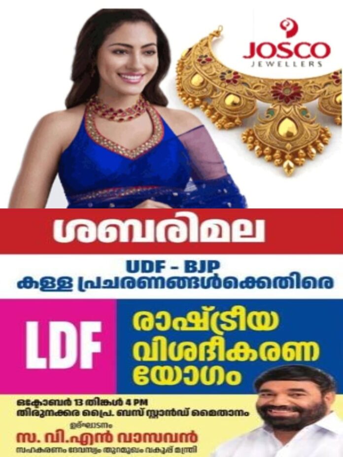 കോട്ടയം : ശബരിമല വിവാദത്തിൽ എൽഡിഎഫ് ജില്ലാ കമ്മിറ്റിയുടെ നേതൃത്വത്തിൽ ഇന്ന് കോട്ടയത്ത് വിശദീകരണയോഗം നടത്തും, പരിപാടിയിൽ ദേവസ്വം വകുപ്പ് മന്ത്രി വി എൻ വാസവൻ പങ്കെടുക്കും.