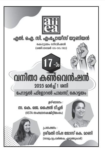 കോട്ടയം: എൽഐസി എംപ്ലോയിസ് യൂണിയൻ കോട്ടയം ഡിവിഷൻ്റെ പതിനേഴാമത് വനിതാ കൺവെൻഷൻ 2025 മാർച്ച് ഒന്നാം തിയതി കോട്ടയത്ത്. രാവിലെ പത്തുമണിക്ക് ആരംഭിക്കുന്ന സമ്മേളനം കെഎസ്ടിഎ സംസ്ഥാന കമ്മിറ്റി അംഗം കെ ജെ ഷൈൻ ടീച്ചർ ഉദ്ഘാടനം ചെയ്യും.