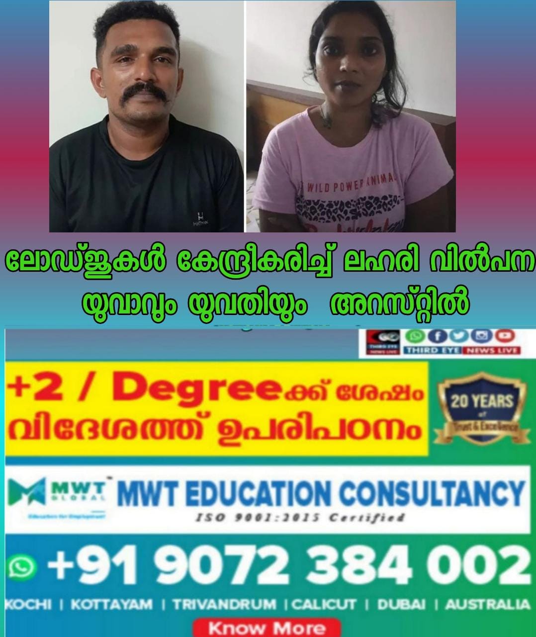 ലോഡ്ജ് കേന്ദ്രീകരിച്ചായിരുന്നു ലഹരിവില്പന. ഇവരില് നിന്ന് അഞ്ച് ഗ്രാം എം.ഡി.എം.എയും ഇത് തൂക്കാനുപയോഗിക്കുന്ന ത്രാസും പിടിച്ചെടുത്തു.