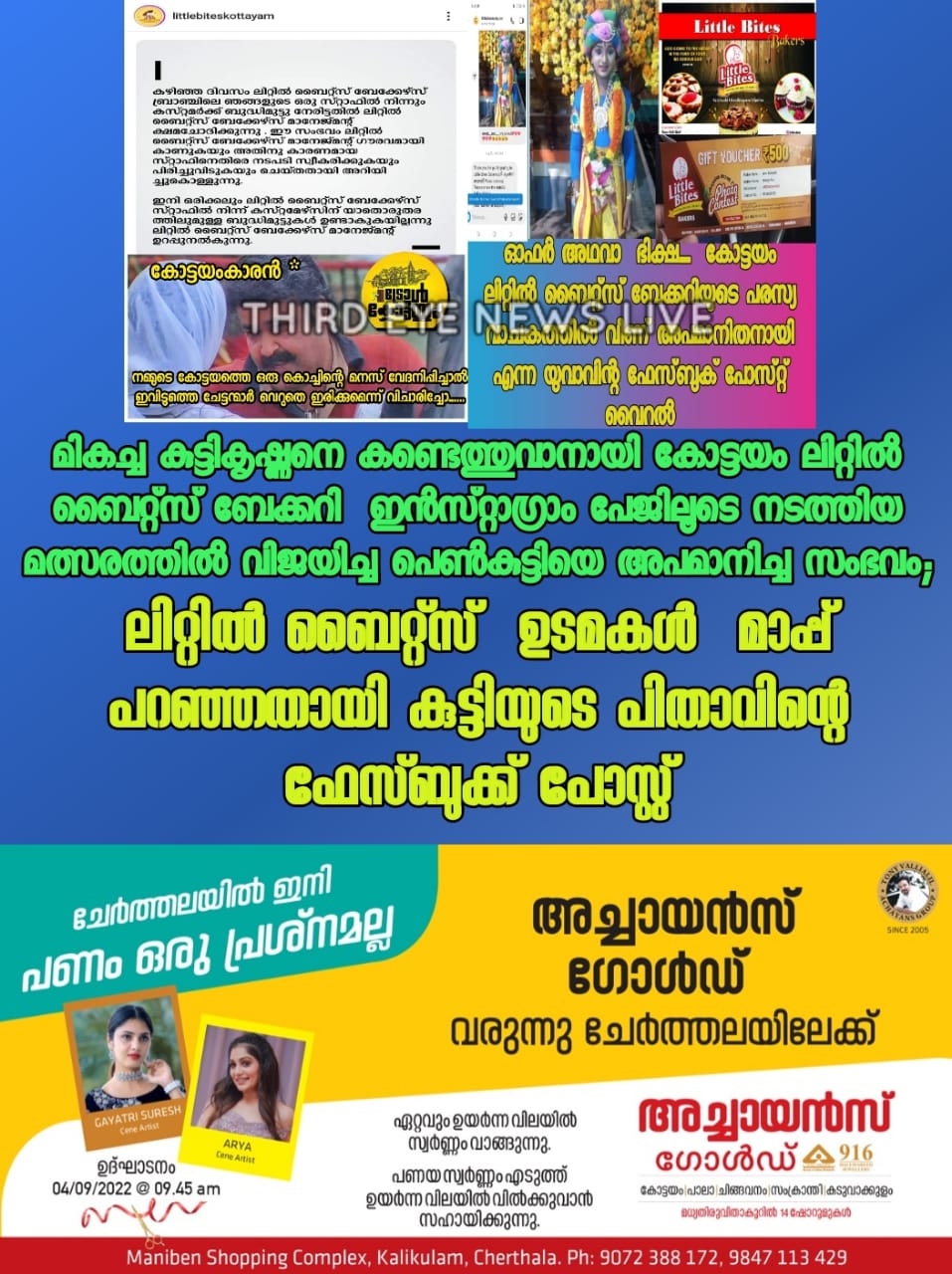 മത്സരിച്ച് വിജയിച്ചു” എന്ന ആത്മവിശ്വാസത്തോടെ വന്ന ഒരു കൊച്ചു പെൺകുട്ടിയെയാണ്, സൗജന്യം പറ്റാൻ വന്നവർ എന്ന രീതിയിൽ ലിറ്റിൽ ബൈറ്റ്സ് ബേക്കറിയുടെ മാനേജ്മെൻ്റ് അവഹേളിച്ചതെന്ന് കുറിപ്പിൽ പറയുന്നു. സ്ഥാപനത്തോട് പ്രതിബദ്ധതയില്ലാത്ത ജീവനക്കരുടെ ഭാഗത്തു നിന്നും ഉണ്ടായ പെരുമാറ്റം ഞങ്ങളെ അങ്ങേയറ്റം വേദനിപ്പിച്ചുവെന്നും പിതാവിന്റെ കുറിപ്പിൽ പറയുന്നു. എന്നാൽ അതിനു ശേഷം അവരുടെ ജനറൽ മാനേജർ സ്റ്റെനി നേരിൽ വന്നു നേരിട്ട് സംസാരിക്കുകയും ലിറ്റിൽ ബൈറ്റ്സിന്റെ ഫേസ്ബുക് പേജിലൂടെ അവർ ക്ഷമാപണം നടത്തുകയും ചെയ്തു.