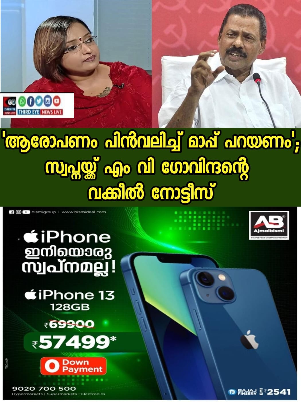 സ്വപ്നയുടെ പരാമർശം വസ്തുത വിരുദ്ധവും തെറ്റുമാണ്. എനിക്കോ എന്റെ കുടുംബത്തിനോ വിജേഷ് പിള്ളയെ അറിയില്ലെന്നും എം വി ഗോവിന്ദൻ പറയുന്നു. ആരോപണം പിൻവലിച്ച് സ്വപ്ന മാപ്പ് പറഞ്ഞില്ലെങ്കിൽ സിവിൽ, ക്രിമിനൽ നിയമപ്രകാരം നടപടി സ്വീകരിക്കും എന്നാണ് നോട്ടീസില് പറയുന്നത്.