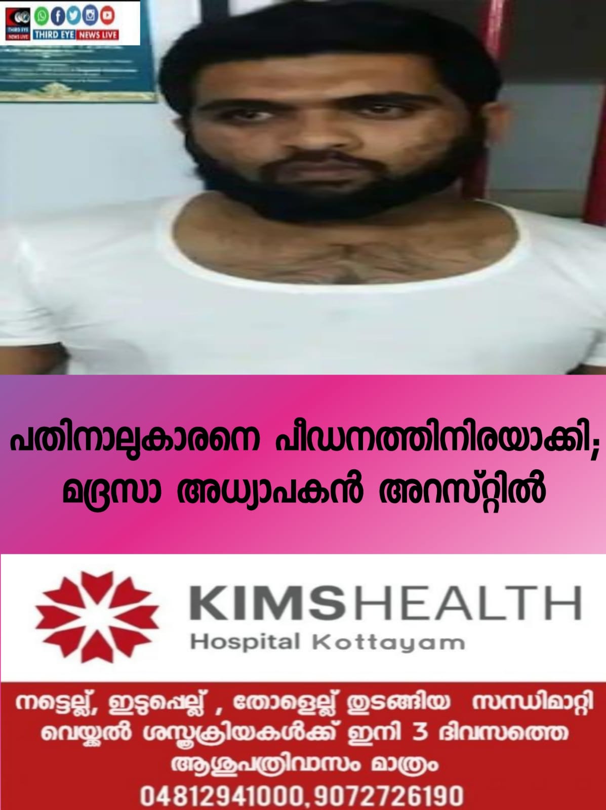 തിരുമിറ്റക്കോട് പഞ്ചായത്തിലെ കറുകപുത്തൂർ മതപഠനശാലയിലെ വിദ്യാർത്ഥിനിയെ ഇര്ഷാദ് അലി നിരന്തരം പീഡനത്തിന് ഇരയാക്കി എന്നാണ് പരാതി. പതിനാല് വയസ്സുകാരനാണ് ചൂഷണത്തിന് ഇരയായത്. കുട്ടിയുടെ പെരുമാറ്റത്തിൽ അസ്വഭാവികത കണ്ടതോടെ വീട്ടുകാർ കൗൺസിലിങ്ങിന് വിധേയമാക്കി.