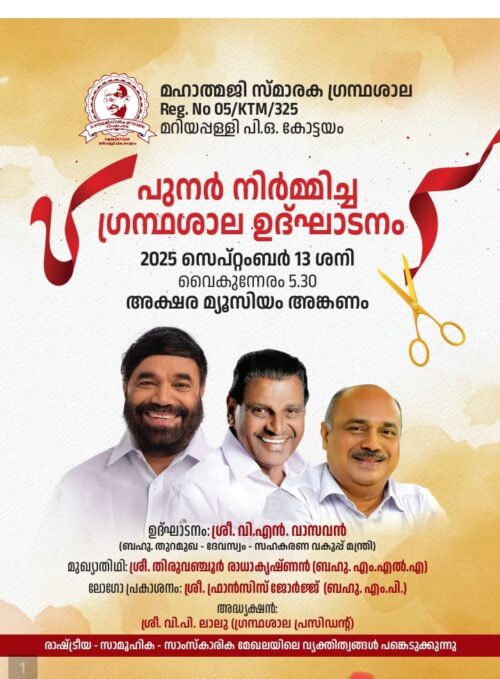 പുനർ നിർമ്മിച്ച ഗ്രന്ഥശാലയുടെ ഉദ്ഘാടനം സെപ്റ്റംബർ 13 ന് ശനിയാഴ്ച വൈകുന്നേരം 5.30 മറിയപള്ളിയിലെ അക്ഷര മ്യൂസിയം അങ്കണത്തിൽ വെച്ച് മന്ത്രി വി എൻ വാസവൻ ഉദ്ഘാടനം ചെയ്യും. തിരുവഞ്ചൂർ രാധാകൃഷ്ണൻ എം എൽ എ മുഖ്യാതിഥിയാവും. അഡ്വ. ഫ്രാൻസിസ് ജോർജ് എംപി ലോഗോ പ്രകാശനം ചെയ്യും. ഗ്രന്ഥശാല പ്രസിഡന്റ് വി പി ലാലു അധ്യക്ഷത വഹിക്കും.