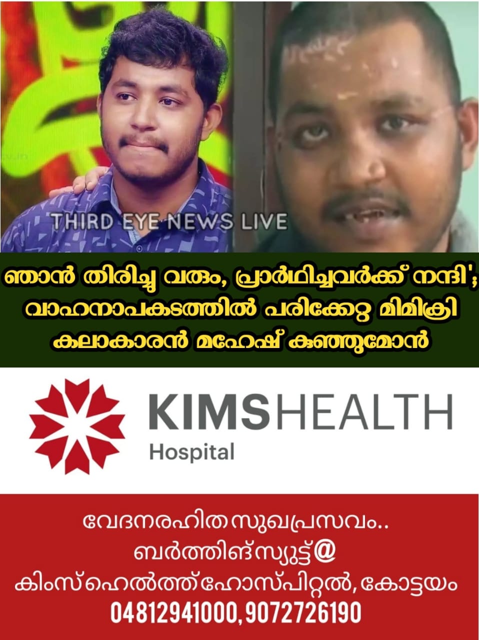 പഴയതിനേക്കാൾ ഊർജ്ജസ്വലനായി തിരിച്ചുവരുമെന്നും അന്നും ഇതുപോലെ കൂടെയുണ്ടാകണമെന്നും മിമിക്രി കലാകാരൻ മഹേഷ് കുഞ്ഞുമോൻ. മഹേഷിന്റെ മുഖത്തും പല്ലുകൾക്കുമായിരുന്നു കൂടുതൽ പരിക്കേറ്റത്. ഒമ്പതുമണിക്കൂർ നീണ്ടുനിന്ന ശസ്ത്രക്രിയകൾക്കായിരുന്നു മഹേഷ് വിധേയനായത്.