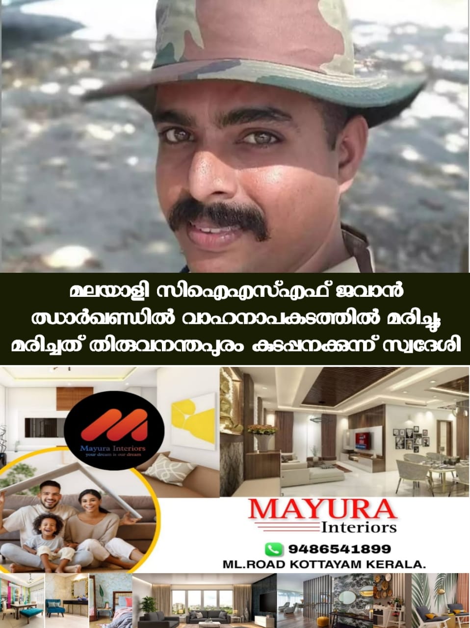 റാഞ്ചി: ഝാര്ഖണ്ഡില് വാഹനാപകടത്തിൽ ലയാളി സിഐഎസ്എഫ് ജവാന് മരിച്ചു. തിരുവനന്തപുരം കുടപ്പനക്കുന്ന് സ്വദേശി അരവിന്ദാണ് മരിച്ചത്.