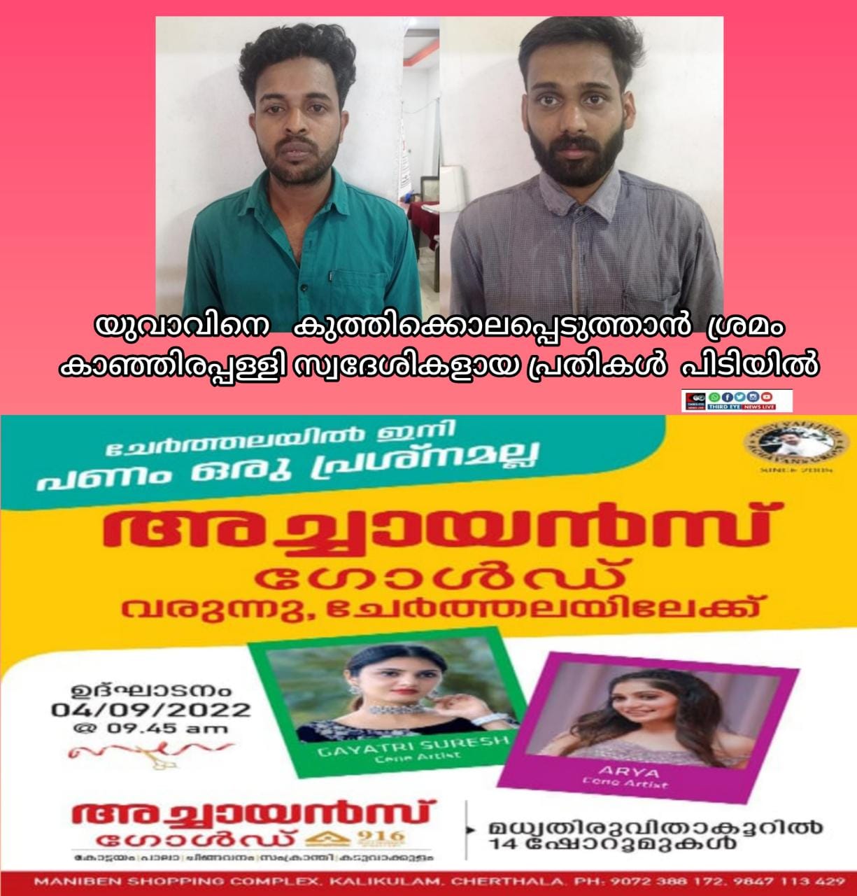 കോട്ടയം : പൊൻകുന്നത്ത് യുവാവിനെ കുത്തിക്കൊലപ്പെടുത്താൻ ശ്രമിച്ച കേസിൽ കാഞ്ഞിരപ്പള്ളി ഇടക്കുന്നം കുഴിവേലിൽ വീട്ടിൽ കൃഷ്ണൻകുട്ടി മകൻ പല്ലക്ക് എന്ന് വിളിക്കുന്ന റ്റിനു കൃഷ്ണൻകുട്ടി (32), കുന്നുംഭാഗം ചേപ്പുംപാറ പടലുങ്കൽ വീട്ടിൽ ഷാജി മകൻ രാഹുൽ ഷാജി(27) എന്നിവരെയാണ് പൊൻകുന്നം പോലീസ് അറസ്റ്റ് ചെയ്തത്.