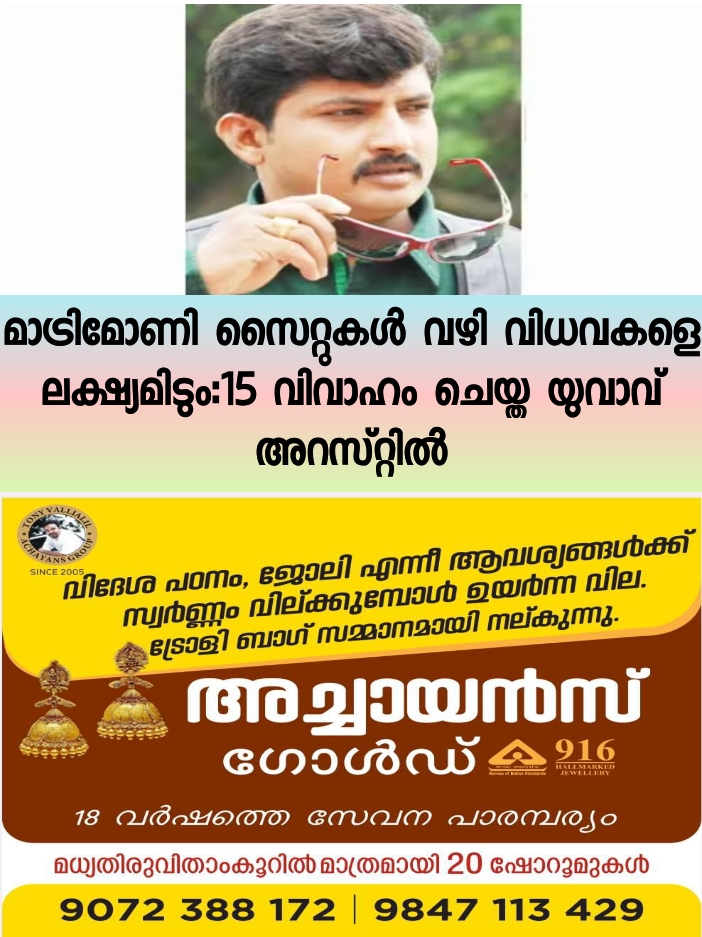 ഡോക്ടര്‍, എഞ്ചിനീയര്‍, സിവില്‍ കോണ്‍ട്രാക്ടര്‍ ജോലികള്‍ പലവിധം ; മാട്രിമോണി സൈറ്റുകള്‍ വഴി ലക്ഷ്യം വെക്കുന്നത് അവിവാഹിതരായ പ്രായമായ സ്ത്രീകള്‍, വിധവകള്‍ എന്നിവരെ ; ഇത്തരത്തിൽ ചെയ്ത് കൂട്ടിയത് 15 വിവാഹങ്ങള്‍ ; യുവാവ് അറസ്റ്റിൽ