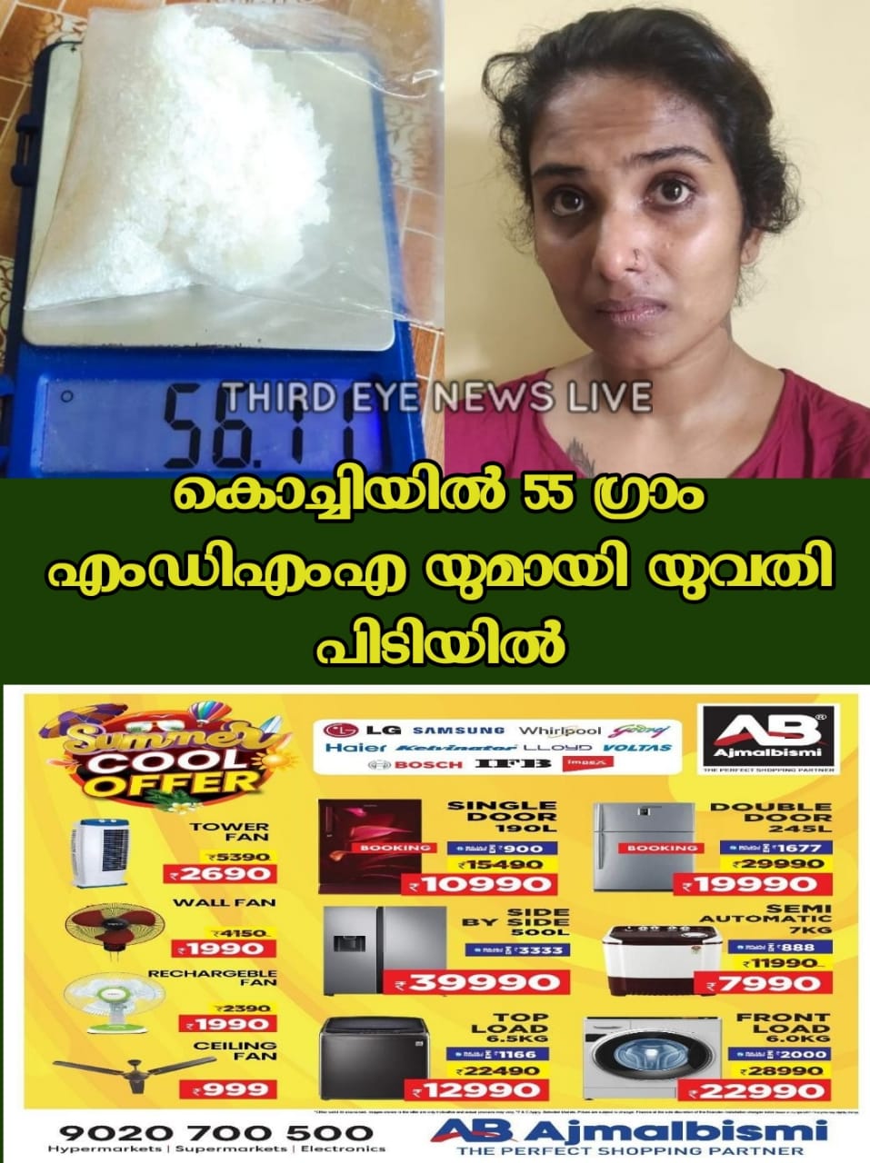 കൊച്ചി: 55 ഗ്രാം എംഡിഎംഎ യുമായി യുവതി പിടിയിൽ. തിരുവനന്തപുരം സ്വദേശി അഞ്ചു കൃഷ്ണയാണ് കൊച്ചിയിൽ പൊലീസിന്റെ പിടിയിലായത്. ഇവരിൽ നിന്നും 55 ഗ്രാം എംഡിഎംഎയും പിടിച്ചെടുത്തു. ഇവരുടെ സുഹൃത്ത് കാസർഗോഡ് സ്വദേശി സമീർ ഓടി രക്ഷപെട്ടു.