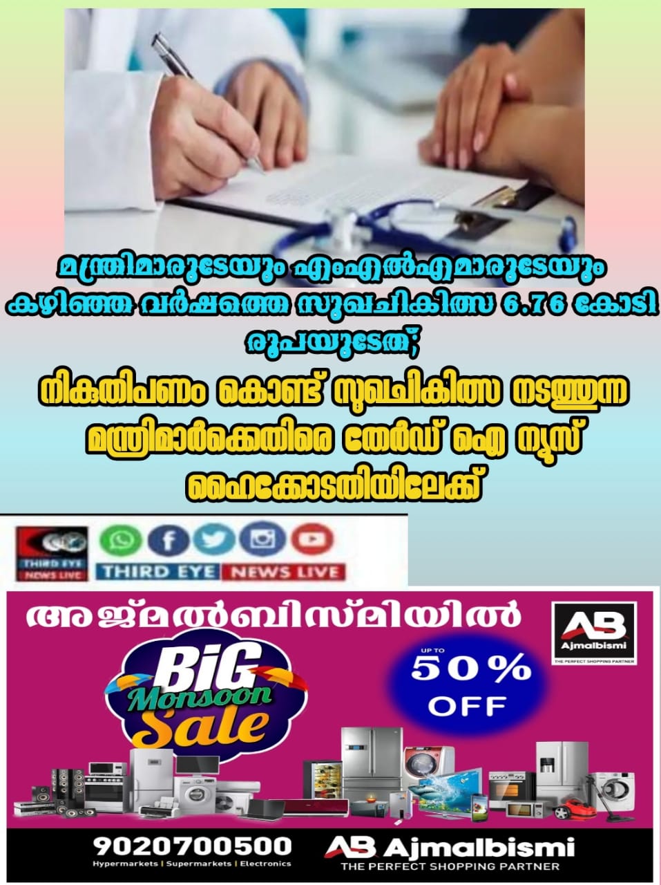 വിദ്യാഭ്യാസത്തിന് സർക്കാർ സ്കൂളുകളും, ആരോഗ്യ രക്ഷയ്ക്കു സർക്കാർ ആശുപത്രിയും എന്നു പരസ്യം ചെയ്യുന്ന സംസ്ഥാന സർക്കാരിലെ എത്ര മന്ത്രിമാർ സർക്കാർ ആശുപത്രിയിൽ ചികിത്സ തേടുന്നുണ്ട് എന്ന് ചോദിച്ചാൽ ഉത്തരം വട്ടപ്പൂജ്യം എന്ന് പറയേണ്ടി വരും.