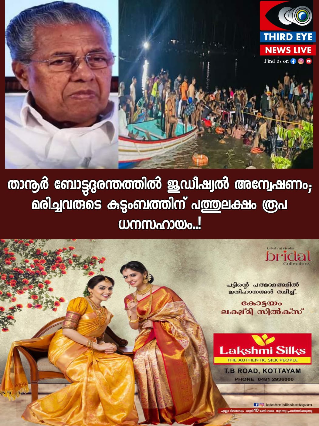 മലപ്പുറം∙ താനൂർ ബോട്ട് അപകടത്തിൽ മരിച്ചവരുടെ കുടുംബങ്ങൾക്ക് 10 ലക്ഷം രൂപ ധനസഹായം പ്രഖ്യാപിച്ചു. ചികിത്സയിലുള്ളവരുടെ മുഴുവൻ ചികിത്സാചെലവും സർക്കാർ വഹിക്കും. സംഭവത്തിൽ മുഖ്യമന്ത്രി പിണറായി വിജയൻ ജുഡീഷ്യൽ അന്വേഷണം പ്രഖ്യാപിച്ചു.