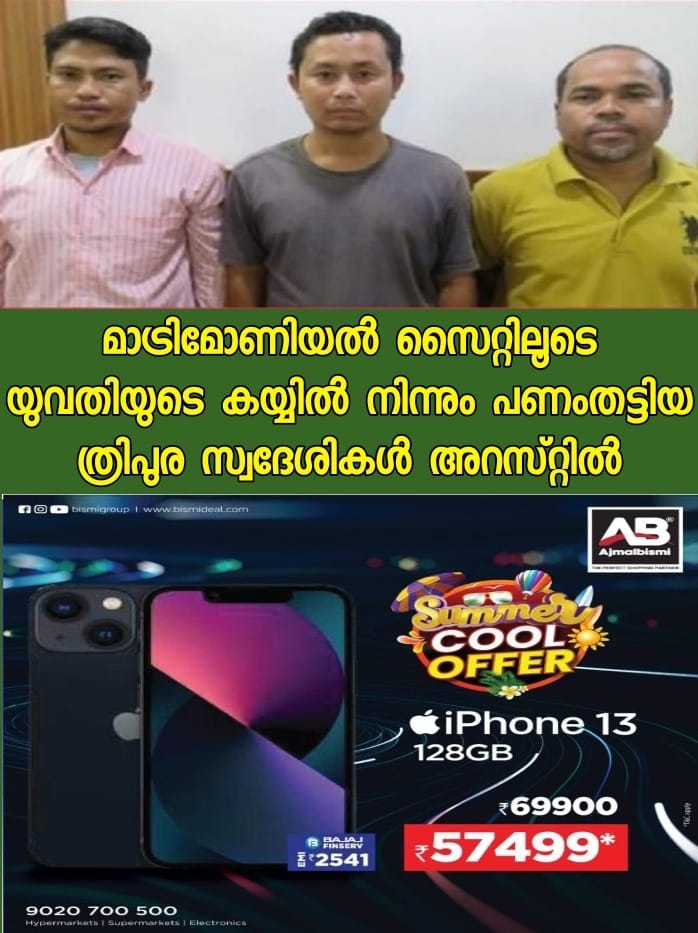 കുമാര് ജമാതിയ (36) സഞ്ജിത് ജമാതിയ (40) സൂരജ് ദെബ്ബര്മ (27) എന്നിവരെയാണ് ത്രിപുരയിലെ തെലിയമുറ എന്ന സ്ഥലത്തുനിന്നും പിടികൂടിയത്.