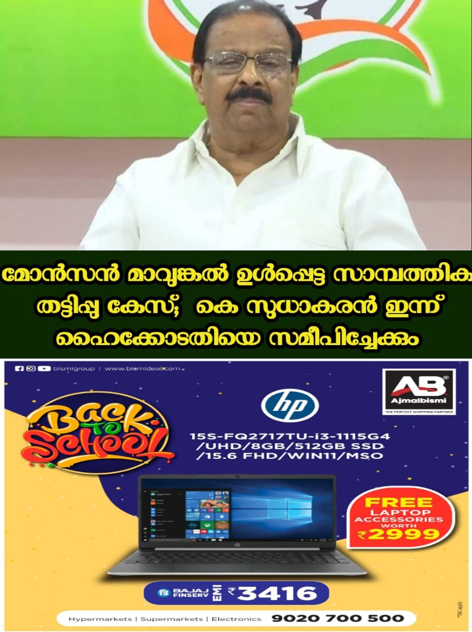 അതേസമയം, മോൻസൻ മാവുങ്കൽ ഉൾപ്പെട്ട സാമ്പത്തിക തട്ടിപ്പു കേസിൽ പ്രതി ചേർക്കപ്പെട്ട കെ സുധാകരൻ ഇന്ന് ഹൈക്കോടതിയെ സമീപിച്ചേക്കും. കേസ് നിലനിൽക്കില്ലെന്നും അറസ്റ്റ് തടയണമെന്നുമാണ് കെ സുധാകരൻ്റെ ആവശ്യം. കേസിൽ നാളെയാണ് ചോദ്യം ചെയ്യലിന് ഹാജരാകണമെന്ന് സുധാകരനോട് ക്രൈം ബ്രാഞ്ച് ആവശ്യപ്പെട്ടിരിക്കുന്നത്. സുധാകരൻ ഇന്ന് 11 മണിക്ക് മാധ്യമങ്ങളെ കാണുന്നുണ്ട്.