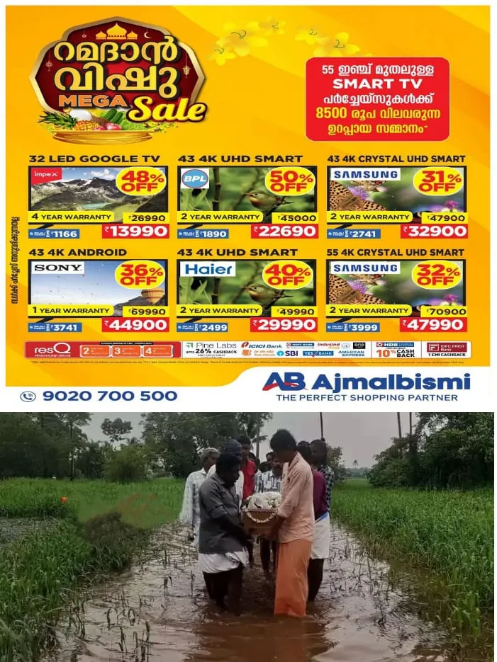 തിരുവല്ല: കനത്തു പെയ്ത മഴയെ തുടർന്ന് തിരുവല്ലയിലെ വേങ്ങലില്‍ പാടശേഖരത്തിന് മധ്യത്തിലൂടെയുള്ള റോഡും താല്‍ക്കാലികമായി നിർമ്മിച്ച പാലവും വെള്ളത്തിനടിയില്‍ ആയതോടെ എൺപതുകാരൻ്റെ മൃതദേഹം ബന്ധുക്കളും സമീപവാസികളും ചേർന്ന് ഏറെ പണിപ്പെട്ട് കരയ്ക്ക് എത്തിച്ചു.