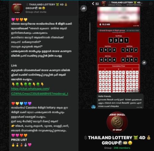 ‘Grand Dragon 4 Digit Group’ എന്ന പേരിൽ പ്രവർത്തിക്കുന്ന വാട്സ്ആപ്പ് ഗ്രൂപ്പിലൂടെയാണ് നിയമവിരുദ്ധമായി നാലക്ക ലോട്ടറി വിൽപന നടക്കുന്നത്. മുന്നൂറോളം അംഗങ്ങളുള്ള ഈ ഗ്രൂപ്പിലൂടെ പ്രതിദിനം ലക്ഷക്കണക്കിന് രൂപയുടെ ഇടപാടുകൾ നടക്കുന്നതായാണ് വിവരം.