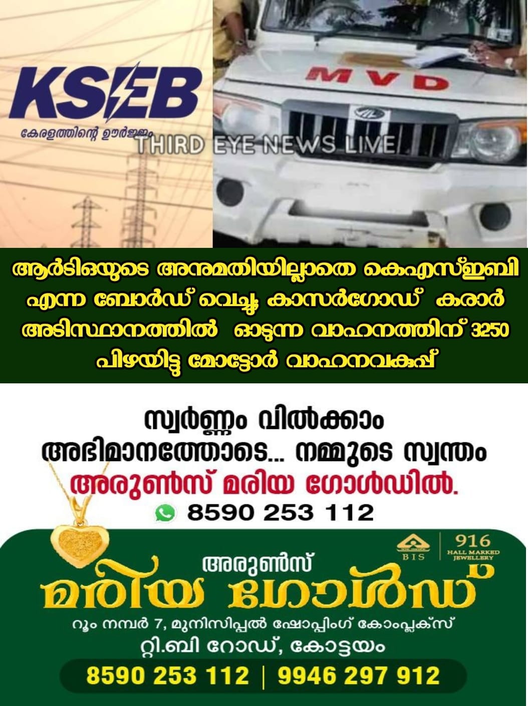 ആർടിഒയുടെ അനുമതിയില്ലാതെ KSEB എന്ന ബോർഡ് വെച്ചതിന് 3250 രൂപയാണ് പിഴയിട്ടത്. നേരത്തെ ബിൽ അടയ്ക്കാത്തതിന് കാസർഗോഡ് ആർടിഒ എൻഫോഴ്സ്മെന്റ് ഓഫീസിലെ ഫ്യൂസ് കെഎസ്ഇബി ഊരിയിരുന്നു.