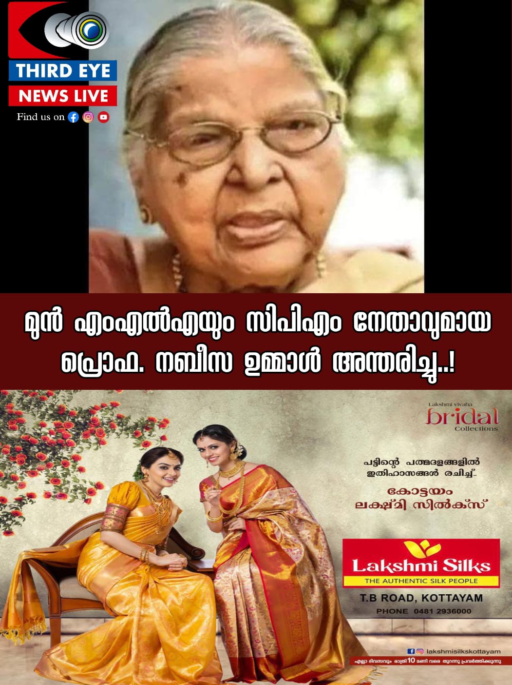 മുന്‍ എംഎല്‍എയും സിപിഎം നേതാവുമായ പ്രൊഫ. നബീസ ഉമ്മാള്‍ അന്തരിച്ചു