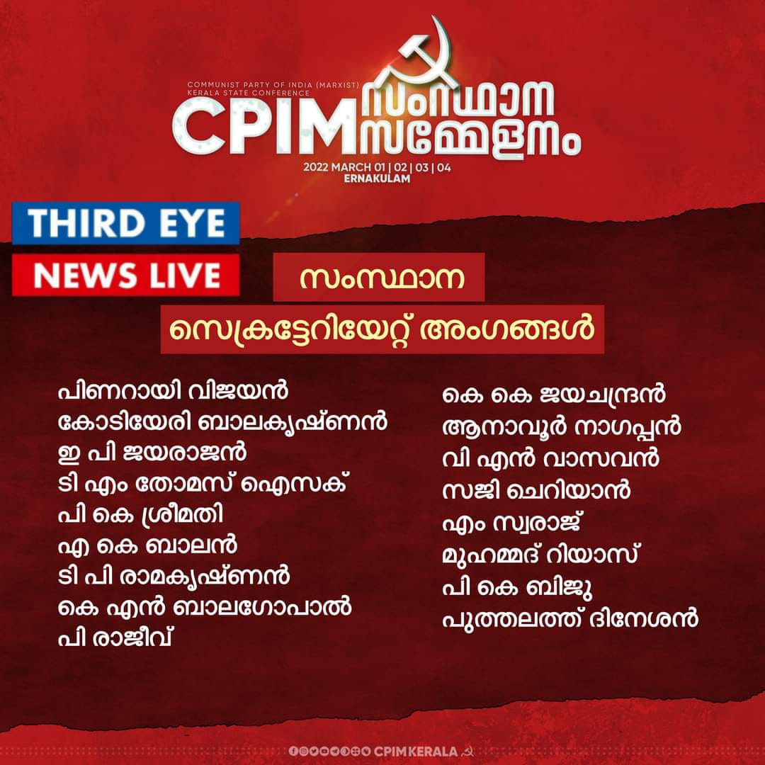 പിണറായി വിജയൻ, കോടിയേരി ബാലകൃഷ്ണൻ, ടി എം തോമസ് ഐസക്, ഇ പി ജയരാജൻ, പി കെ ശ്രീമതി, എം സി ജോസഫൈൻ, എ വിജയരാഘവൻ, കെ കെ ശൈലജ, എളമരം കരീം, എ കെ ബാലൻ, എം വി ഗോവിന്ദൻ, ബേബി ജോൺ, ടി പി രാമകൃഷ്ണൻ, കെ എൻ ബാലഗോപാൽ, പി രാജീവ്, കെ രാധാകൃഷ്ണൻ, കെ പി സതീഷ് ചന്ദ്രൻ, എം വി ബാലകൃഷ്ണൻ, സി എച്ച് കുഞ്ഞമ്പു,