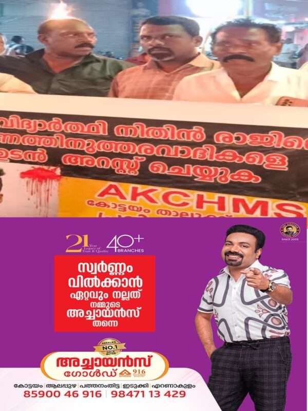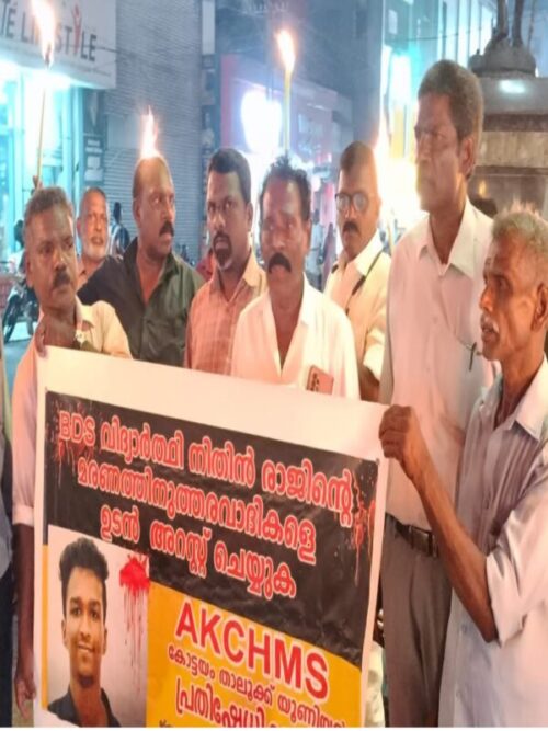 എ കെ സി എച്ച് എം എസ് കോട്ടയം താലൂക്ക് യൂണിയന്റെ നേതൃത്വത്തിൽ ഗാന്ധി സ്ക്വയറിൽ പന്തം കൊളുത്തി പ്രതിഷേധ യോഗം നടത്തി.