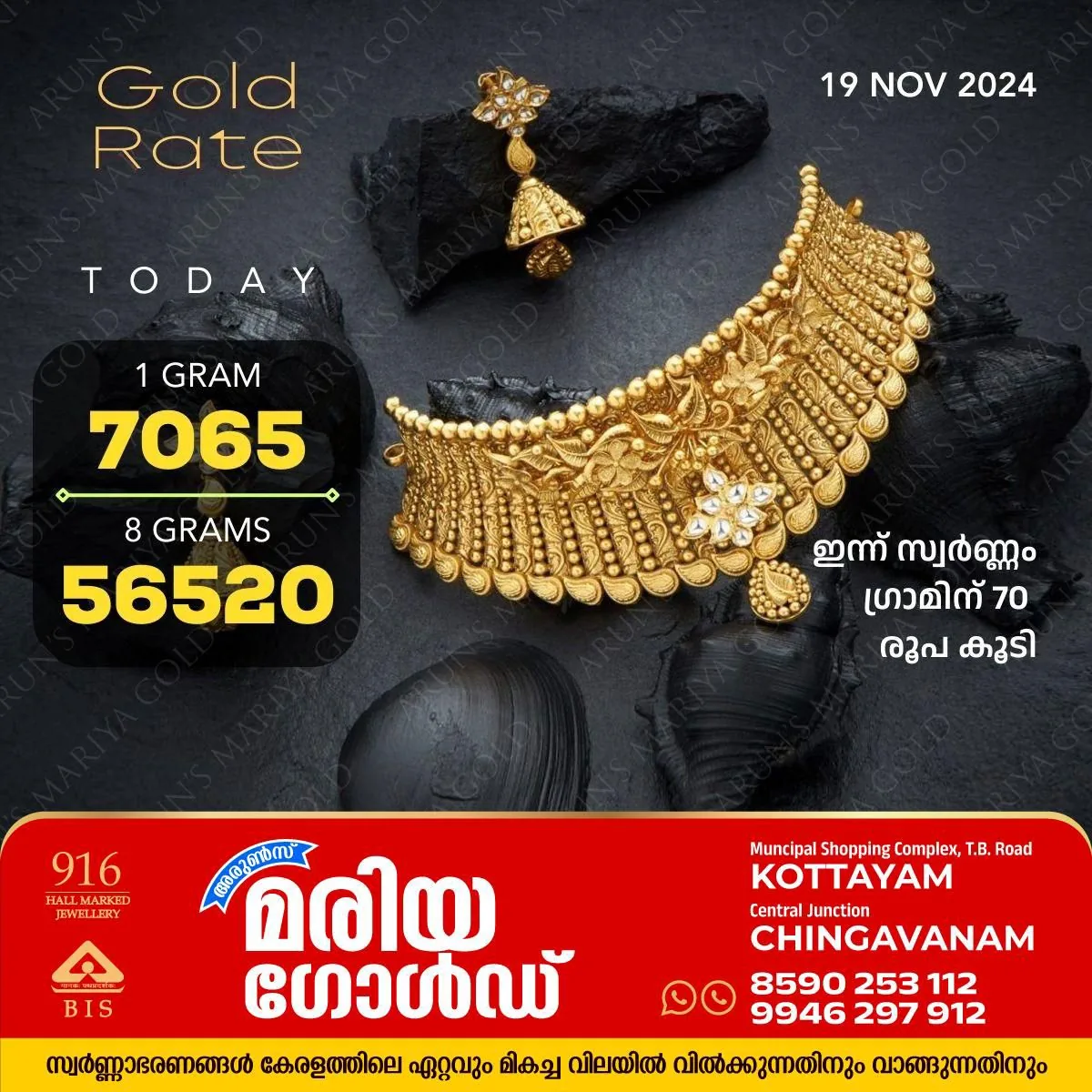 കോട്ടയം : സംസ്ഥാനത്ത് വീണ്ടും സ്വർണവില ഉയർന്നു. അറിയാം കോട്ടയം അരുൺസ് മരിയ ഗോൾഡിലെ സ്വർണ വില. ഇന്ന് ഗ്രാമിന് 70 രൂപയാണ് കൂടിയത്. ഇതോടെ വില 7065 രൂപയിലെത്തി. പവന് 560 രൂപ കൂടി 56520 രൂപയിലാണ് വ്യാപാരം പുരോഗമിക്കുന്നത്.