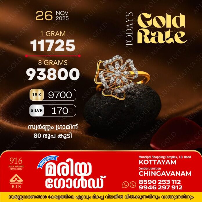 അറിയാം അരുൺസ് മരിയാ ഗോൾഡിലെ ഇന്നത്തെ സ്വർണ വില. 93,800 രൂപയാണ് ഇന്ന് ഒരു പവൻ സ്വർണത്തിൻ്റെ വിപണി വില. 11,725 രൂപയാണ് ഒരു ഗ്രാം സ്വർണത്തിന് ഇന്ന് നൽകേണ്ടത്.