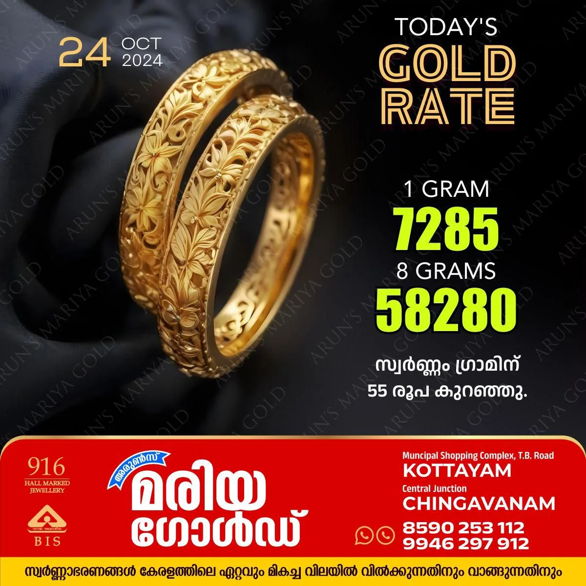 കോട്ടയം : സംസ്ഥാനത്തെ സ്വർണവിലയിൽ ഇന്ന് നേരിയ ആശ്വാസം. സ്വർണ്ണത്തിന് 440 രൂപയുടെ കുറവാണ് വിലയിലുണ്ടായിട്ടുള്ളത്. ഇതോടെ 58, 280 എന്ന നിരക്കിലാണ് ഇന്ന് വ്യാപാരം നടക്കുന്നത്. സ്വർണ്ണം ഗ്രാമിന് 55 രൂപ കുറഞ്ഞു, ഒരു ഗ്രാം സ്വർണത്തിന് കോട്ടയം അരുൺസ് മരിയാ ഗോൾഡിൽ ഇന്ന് 7285 രൂപയാണ് വില.