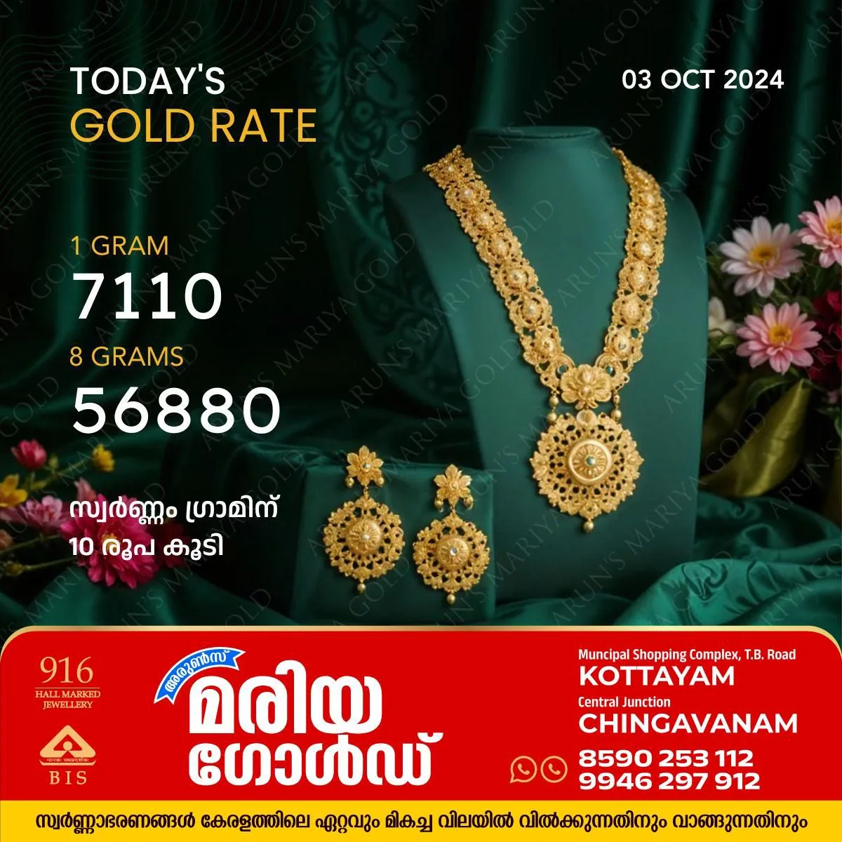 ഇത്തരത്തിൽ ഇന്ന് ഒരു പവൻ സ്വർണ്ണത്തിന് 56,880 രൂപയും, ഗ്രാമിന് 7,110 രൂപയുമാണ് വില. ഇത് സംസ്ഥാനത്തിന്റെ ചരിത്രത്തിലെ റെക്കോർഡ് ഉയരമാണ്.