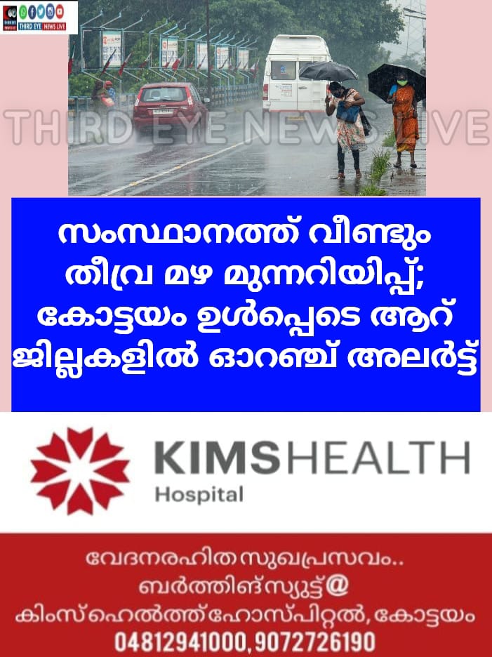 തിരുവനന്തപുരം: സംസ്ഥാനത്ത് വീണ്ടും തീവ്ര മഴ മുന്നറിയിപ്പ്. 6 ജില്ലകളിൽ ഇന്ന് ഓറഞ്ച് അലർട്ട് പ്രഖ്യാപിച്ചു. പത്തനംതിട്ട, ആലപ്പുഴ, കോട്ടയം, എറണാകുളം, ഇടുക്കി, തൃശ്ശൂർ ജില്ലകളിലാണ് ഓറഞ്ച് അലർട്ട് പ്രഖ്യാപിച്ചിട്ടുള്ളത്.