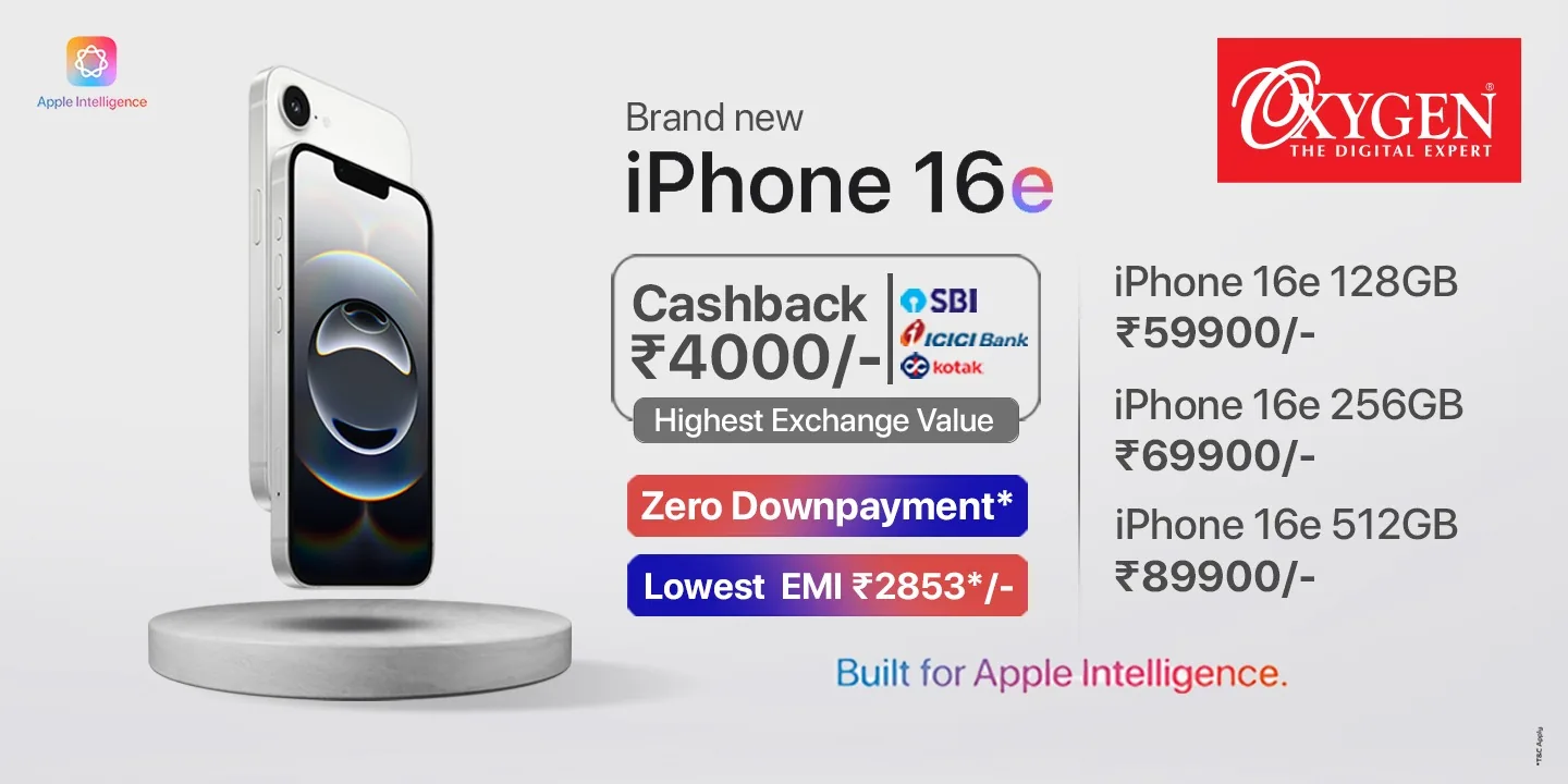 4000 രൂപ വരെ ക്യാഷ്ബാക്കോട് കൂടി ഐഫോൺ 16e ഓക്സിജനിൽ നിന്നും സ്വന്തമാക്കാവുന്നതാണ്. കൂടാതെ സീറോ ഡൗൺപേയ്മെന്റ് ഓപ്ഷനും ഒരുക്കിയിട്ടുണ്ട്. മാസതവണ വെറും 2853 രൂപയിൽ തുടങ്ങുന്ന EMI സ്കീമും, പഴയ ഐഫോൺ എക്സ്ചേഞ്ച് ചെയ്യുന്നതിലൂടെ 29000 രൂപ വരെ അഡീഷണൽ ഡിസ്കൗണ്ട് നൽകുന്ന സ്പെഷ്യൽ ഓഫറുകളും ഐഫോൺ 16e പർച്ചെയ്സ് ചെയ്യുമ്പോൾ ഓക്സിജനിലൂടെ ലഭിക്കുന്നതാണ്.
