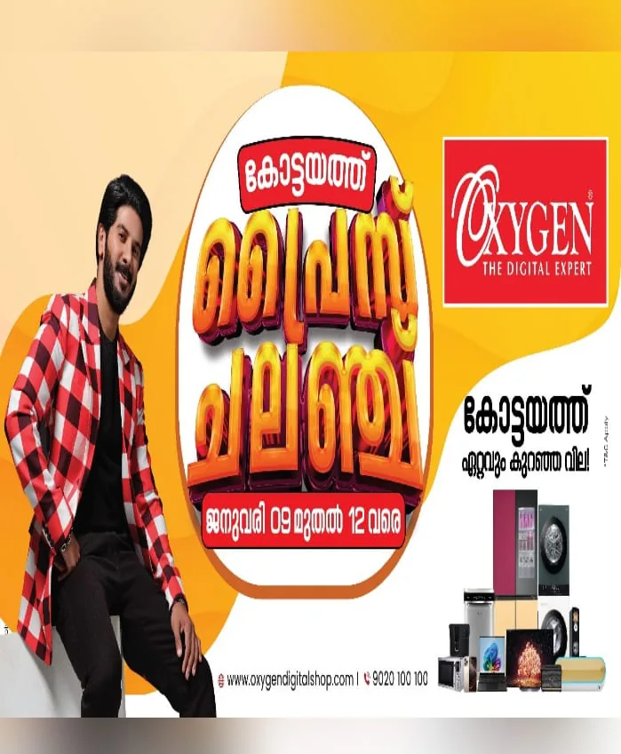 കോട്ടയം: ജില്ലയിലെ മുഴുവൻ ഓക്സിജൻ ഷോറൂമുകളിലും ഈ മാസം 9, 10, 11, 12 തിയതികളിൽ മെഗാ പ്രൈസ് ചലഞ്ച് സെയിൽ നടത്തുന്നു.. സ്മാർട്ട്ഫോൺ, ലാപ്ടോപ്പ്, ഗൃഹോപകരണങ്ങൾ തുടങ്ങി എല്ലാ ഡിജിറ്റൽ ഉൽപ്പന്നങ്ങളും ജില്ലയിലെ ഏറ്റവും കുറഞ്ഞ വിലയിൽ ഒക്സിജനിൽ നിന്നും വാങ്ങാവുന്നതാണ്.