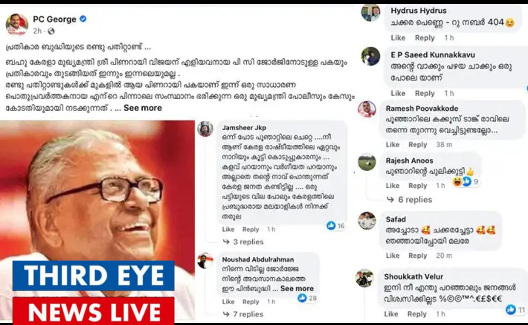 സംസ്ഥാന കമ്മിറ്റിയിൽ നിങ്ങൾ അധിപധ്യം ഉറപ്പിച്ച അന്ന് മുതൽ ഇവിടെ കമ്മ്യൂണിസം മരിച്ചുവെന്നും പിണറായിസമാണ് ഇപ്പോൾ നടപ്പിലാവുന്നതെന്നും പി സി ജോർജ് കുറ്റപ്പെടുത്തി. ‘വി എസ് ഇന്ന് ആരോഗ്യവാനായിരുന്നുവെങ്കിൽ നിങ്ങളുടെ രാജി ആദ്യം ആവശ്യപ്പെടുക അദ്ദേഹമായിരിക്കും. കാരണം, ഭാരതത്തിൽ ഇന്ന് ജീവിച്ചിരിക്കുന്ന ഒരേ ഒരു കമ്മ്യൂണിസ്റ്റ് , യഥാർത്ഥ കമ്മ്യൂണിസ്റ്റ് വി എസ് മാത്രമാണെന്നും പി സി ജോർജ് പറഞ്ഞു. എന്നാൽ പി സി ജോർജിന്റെ പോസ്റ്റിനെതിരെ വലിയ തോതിലുള്ള സൈബർ ആക്രമണമാണുണ്ടായത്.