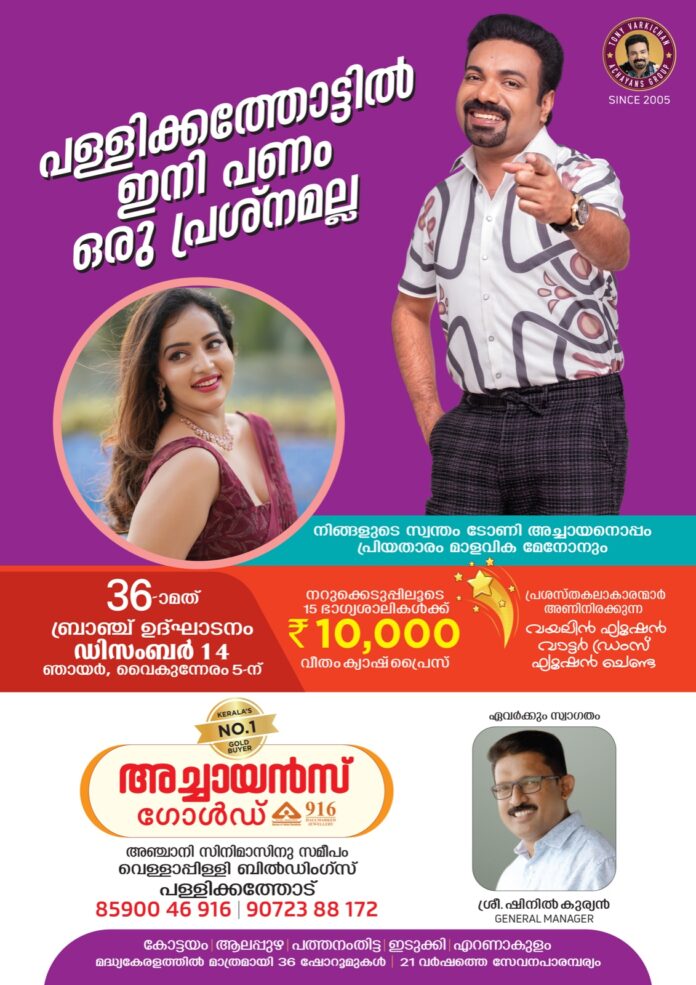 പള്ളിക്കത്തോടുകാർക്ക് ഇനി പണത്തിന് പഞ്ഞമില്ല! പ്രതിസന്ധി ഘട്ടങ്ങളിൽ ഉയർന്ന വിലയ്ക്ക് സ്വർണ്ണം വിൽക്കാൻ അച്ചായൻസ് ഗോൾഡ് ഇപ്പോൾ പള്ളിക്കത്തോടും ; ഡിസംബർ 14 ഞായറാഴ്ച വൈകിട്ട് 4 മണിക്ക് പ്രശസ്ത നടി മാളവിക മേനോനും അച്ചായൻസ് ഗോൾഡ് മാനേജിംഗ് ഡയറക്ടർ ടോണി വർക്കിച്ചനും ചേർന്ന് ഉദ്ഘാടനം ചെയ്യുന്നു; ഉദ്ഘാടന വേളയിൽ പങ്കെടുക്കുന്ന 10 ഭാഗ്യശാലികൾക്ക് 10000/- രൂപ വീതം സമ്മാനവും ; അപ്പോൾ നാളെ വൈകിട്ടെന്താ പരിപാടി ; നേരെ പള്ളിക്കത്തോട്ടിലേയ്ക്ക് പോര്