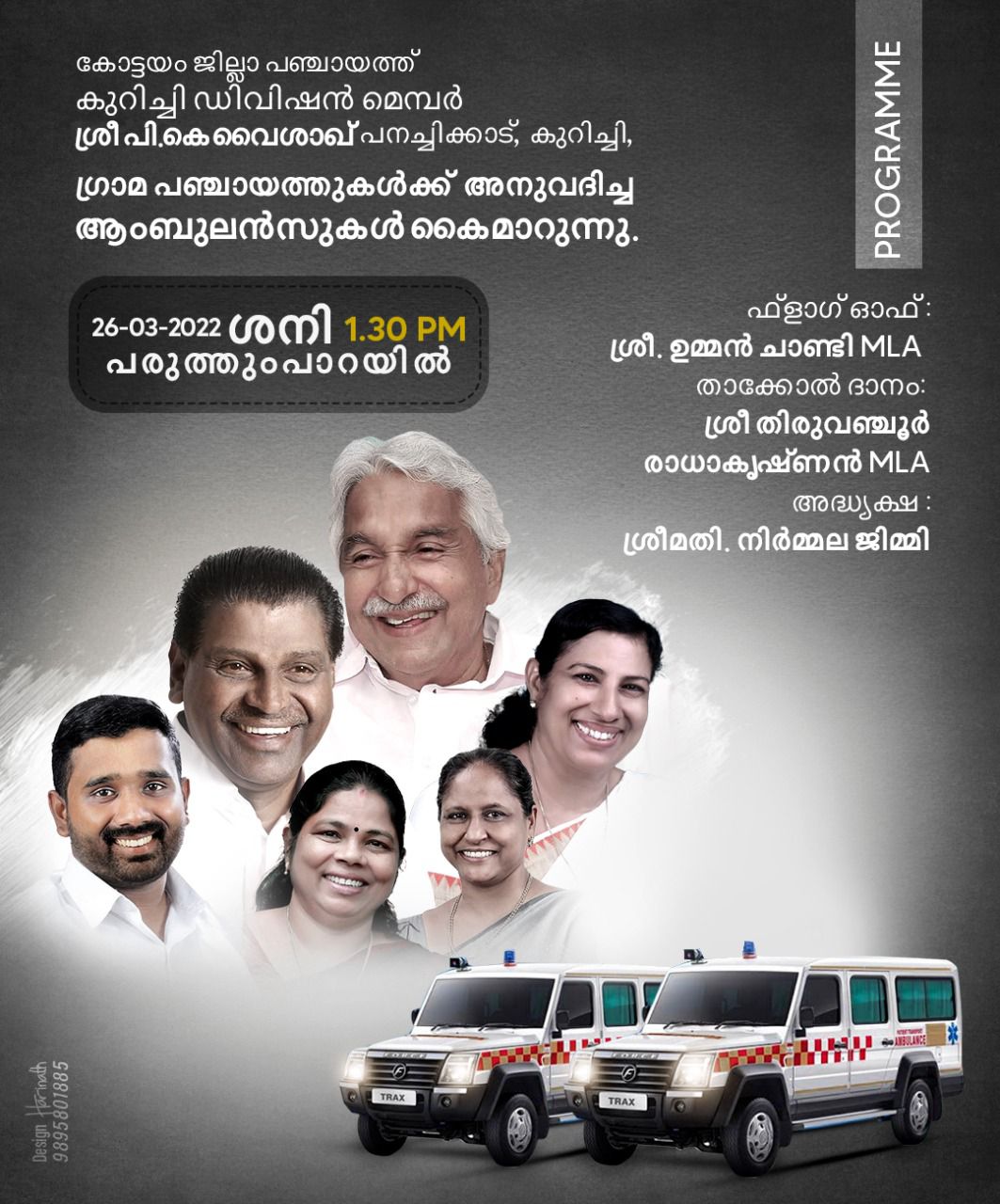 മാർച്ച് 26 ശനിയാഴ്ച ഉച്ചക്ക് 1.30 ന് പനച്ചിക്കാട് പഞ്ചായത്ത് ഓഡിറ്റോറിയത്തിൽ നടക്കുന്ന സമ്മേളനം മുൻ മുഖ്യമന്ത്രി ഉമ്മൻചാണ്ടി ഫ്ളാഗ് ഓഫ് ചെയ്യും. തിരുവഞ്ചൂർ രാധാകൃഷ്ണൻ എം എൽ എ താക്കോൽ ദാനം നിർവഹിക്കും . ജില്ലാ പഞ്ചായത്ത് പ്രസിഡൻ്റ് നിർമ്മല ജിമ്മി അധ്യക്ഷത വഹിക്കും. ജില്ലാ പഞ്ചായത്ത് മെമ്പർ പി കെ വൈശാഖ് എന്നിവർ പങ്കെടുക്കും.