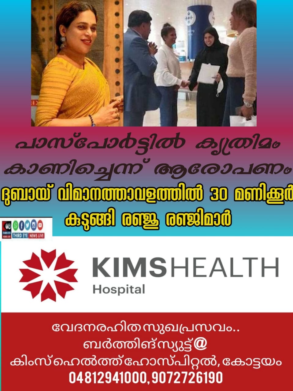 ദുബായ് : വിമാനത്താവളത്തില് 30 മണിക്കൂര് കുടുങ്ങിയതിന്റെ അനുഭവം പങ്കുവച്ച് ട്രാന്സ്ജെന്റര് ആക്ടിവിസ്റ്റും മേക്കപ്പ് ആര്ട്ടിസ്റ്രുമായ രഞ്ജു രഞ്ജിമാര്.പാസ്പോര്ട്ടില് കൃത്രിമം കാണിച്ചെന്ന് ആരോപിച്ച് ഡീപോര്ട്ട് നടത്താനായിരുന്നു ശ്രമമെന്നും ഒടുവില് അഭിഭാഷകരും ഇന്ത്യന് കോണ്സുലേറ്റിലെ ഉദ്യോഗസ്ഥരുമെത്തി വിവരം ധരിപ്പിച്ചതോടെയാണ് വിമാനത്താവളത്തില് നിന്ന് പുറത്തിറങ്ങാനായതെന്നും രഞ്ജു പറഞ്ഞു. ഫേസ്ബുക്കില് പങ്കുവച്ച വീഡിയോയിലൂടെയാണ് അവര് അനുഭവം പങ്കുവച്ചത്.
