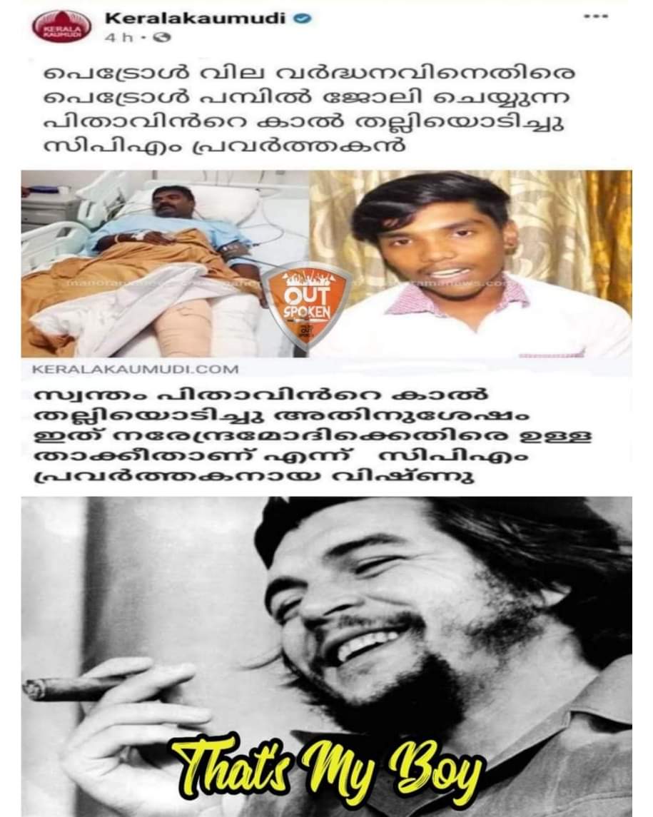 കോട്ടയം: രണ്ടു ദിവസമായി സോഷ്യൽ മീഡിയയിൽ പ്രചരിക്കുന്ന ഒരു വാർത്തയാണ് ഇത്. പെട്രോൾ ഡീസൽ വില വർദ്ധനവിന് എതിരെ പെട്രോൾ പമ്പിൽ ജോലി ചെയ്യുന്ന പിതാവിന്റെ കാൽ സി.പി.എം പ്രവർത്തകനായ മകൻ തല്ലിയൊടിച്ചെന്നാണ് വാർത്ത.