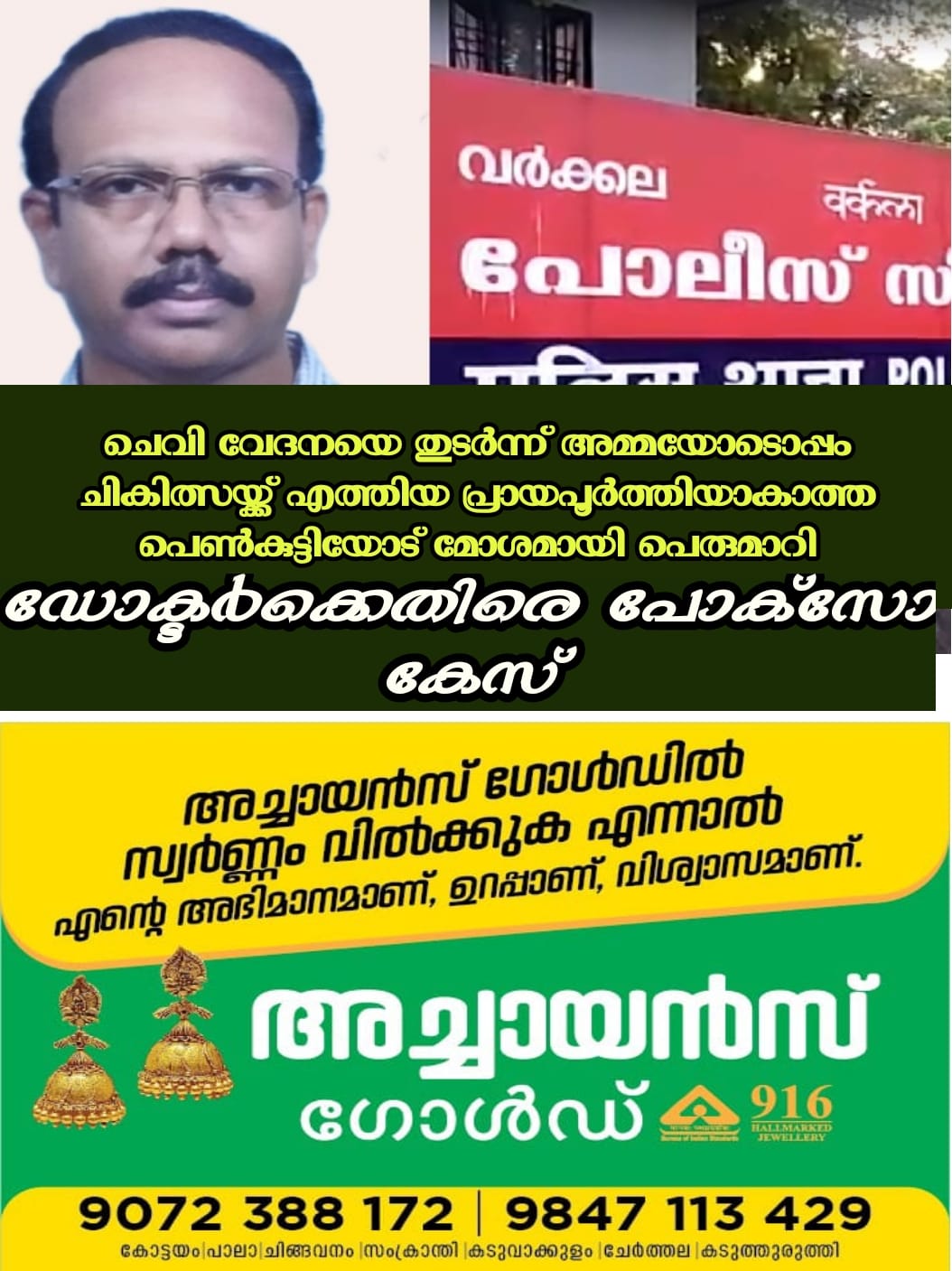 ആറ്റിങ്ങൽ സ്വദേശിനിയായ പെൺകുട്ടിക്ക് നേരെയാണ് ഡോക്ടറുടെ അതിക്രമം. ചെവിക്കകത്തുള്ള പരിശോധനയെന്ന പേരിൽ പെൺകുട്ടിയുടെ സ്വകാര്യ ഭാഗങ്ങളിൽ ഡോക്ടർ സ്പർശിച്ചതോടെ അസ്വസ്ഥയായ പെൺകുട്ടി ഡോക്ടറിൽ നിന്നും കുതറി മാറാൻ ശ്രമിച്ചു. ഇതോടെ ഡോക്ടർ പെൺകുട്ടിയോട് സൗഹൃദപരമായി സംസാരിക്കുകയും സ്വകാര്യഭാഗം പെൺകുട്ടിയുടെ ശരീരത്തിൽ ഉരസുകയുമായിരുന്നു.