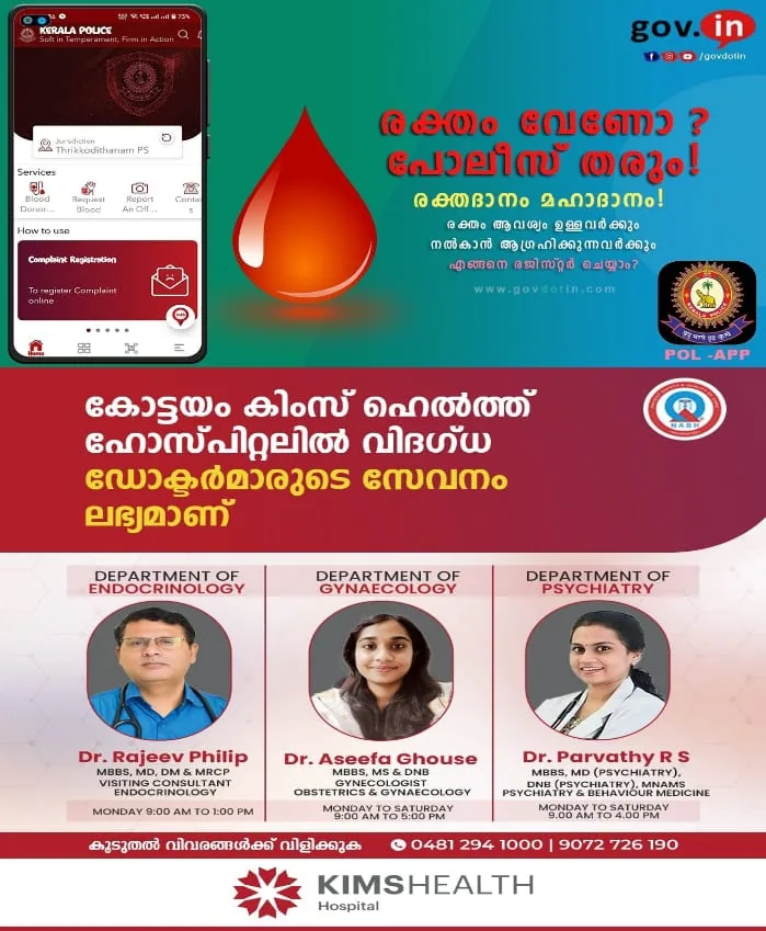 രക്തം അടിയന്തരഘട്ടങ്ങളിൽ സ്വീകരിക്കാൻ മാത്രമുള്ളതല്ല, രക്തദാനത്തിനും നാം തയ്യാറാകണം. ഇതുവരെ പൊതുജനങ്ങളുടെ സഹായത്തോടെ ഇരുപതിനായിരം യൂണിറ്റോളം രക്തം ആവശ്യക്കാർക്ക് എത്തിച്ചുനൽകാൻ കേരള പോലീസിന് കഴിഞ്ഞിട്ടുണ്ട്.