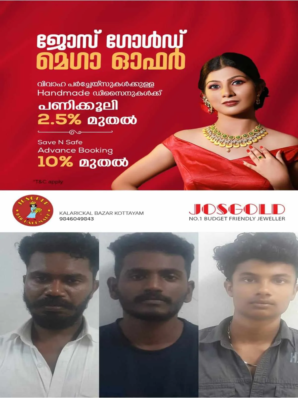 കാഞ്ഞിരപ്പള്ളി ഡി.വൈ.എസ്.പി എം.അനിൽകുമാർ, മണിമല സ്റ്റേഷൻ എസ്.എച്ച്.ഓ ജയപ്രസാദ്, എസ്.ഐ വിജയകുമാർ, എ.എസ്. ഐ സിന്ധുമോൾ, സി.പി.ഓ മാരായ വിനോദ്, സാജു പി.മാത്യു, ഹരീഷ് കെ.ഗോപി, സജിത്ത്, രവീന്ദ്രൻ എന്നിവർ ചേർന്നാണ് ഇവരെ അറസ്റ്റ് ചെയ്തത്. മൂവരെയും കോടതിയിൽ ഹാജരാക്കി.