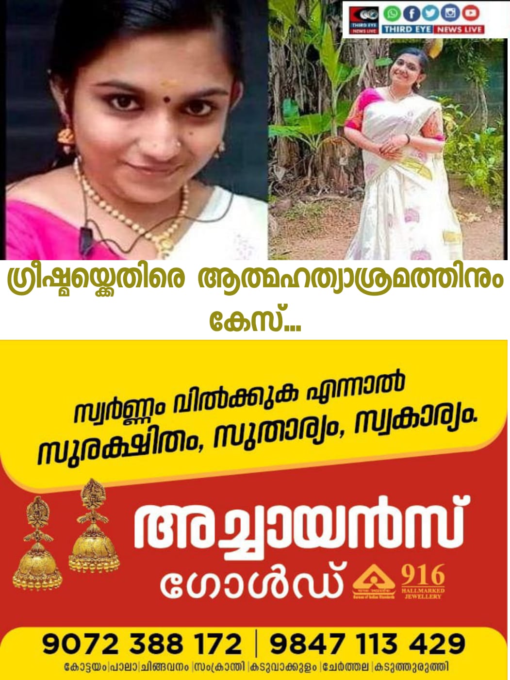 പാറശാല ഷാരോൺ രാജ് കൊലക്കേസ് പ്രതി ഗ്രീഷ്മക്കെതിരെ ആത്മഹത്യ ശ്രമത്തിന് പൊലീസ് കേസെടുത്തു. നെടുമങ്ങാട് പൊലീസ് ആണ് ആത്മഹത്യാ ശ്രമത്തിന് കേസെടുത്തത്. കഴിഞ്ഞ ദിവസം പൊലീസ് സ്റ്റേഷനിലെ ശുചിമുറിയില് വെച്ച് ഗ്രീഷ്മ ലൈസോള് കുടിച്ച് ആത്മഹത്യാ ശ്രമം നടത്തിയിരുന്നു. ഛര്ദിച്ചതിനെ തുടര്ന്ന് മെഡിക്കല് കോളജ് ആശുപത്രിയിലേക്ക് മാറ്റിയതിനാല് അപകടനില തരണം ചെയ്യുകയായിരുന്നു. ആത്മഹത്യാ ശ്രമം നടത്തിയ ഗ്രീഷ്മയുടെ ആരോഗ്യ സ്ഥിതി പരിശോധിച്ച് ആശുപത്രി സെല്ലിലേക്കോ ജയിലിലേക്കോ മാറ്റിയേക്കും. ഗ്രീഷ്മയെ കസ്റ്റഡിയിൽ ലഭിക്കാനുള്ള അപേക്ഷ പൊലീസ് നെയ്യാറ്റിൻകര കോടതിയിൽ നൽകും.