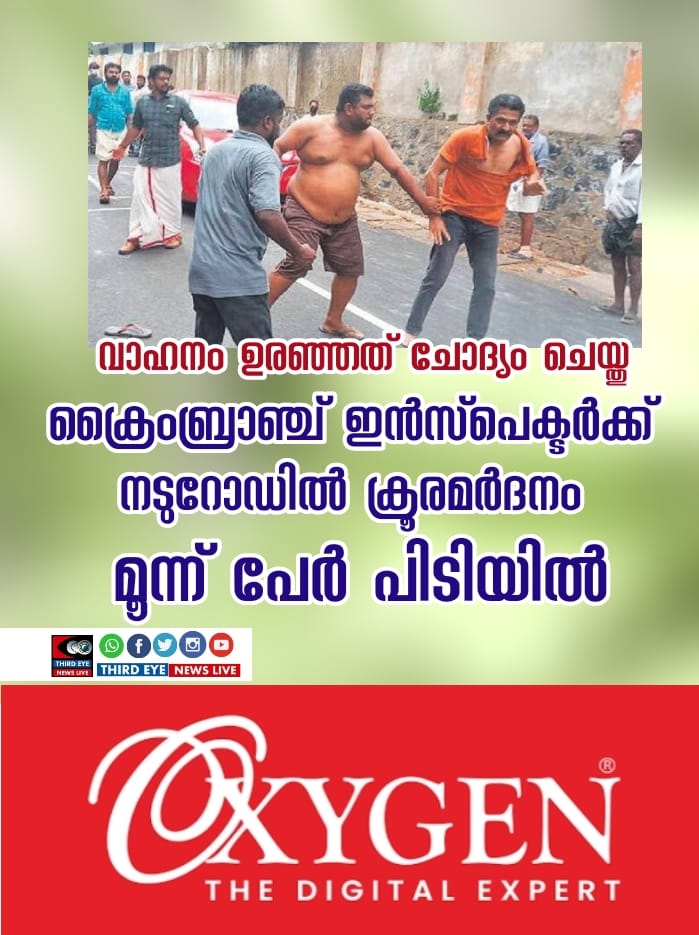 കൊല്ലം പരവൂര് സ്വദേശിയും തിരുവനന്തപുരം ക്രൈംബ്രാഞ്ച് ഇന്സ്പെക്ടറുമായ ബിജുവിനെയാണ് മൂന്നംഗ സംഘം ക്രൂരമായി കയ്യേറ്റം ചെയ്തത്.