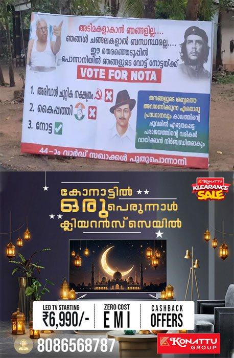 ഈ തെരഞ്ഞെടുപ്പില് തങ്ങളുടെ വോട്ട് ‘നോട്ട’യ്ക്കായിരിക്കുമെന്ന് സഖാക്കള് ഈ പോസ്റ്ററിലൂടെ പരസ്യമായി പ്രഖ്യാപിക്കുന്നു.