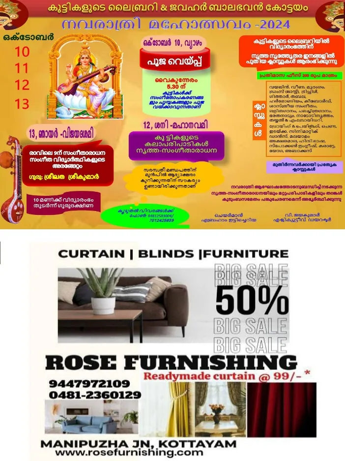 കോട്ടയം: കുട്ടികളുടെ ലൈബ്രറി ആൻഡ് ജവഹർബാലഭവനിൽ നവരാത്രി ആഘോഷം ഒക്ടോബർ 10മുതൽ 13വരെ നടക്കും.