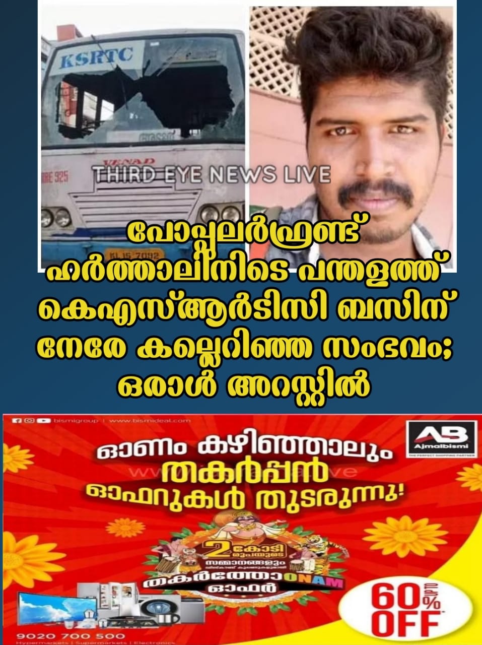 പത്തനംതിട്ട: പോപ്പുലര്ഫ്രണ്ട് ഹര്ത്താലിനിടെ പന്തളത്ത് കെഎസ്ആര്ടിസി ബസിന് നേരേ കല്ലെറിഞ്ഞയാള് പിടിയില്. ഹരിപ്പാട് ചെറുതല സ്വദേശി സനോജാണ് പിടിയിലായത്. സ്കൂട്ടറിലെത്തി കല്ലെറിഞ്ഞശേഷം കടന്നുകളയുകയായിരുന്നു.