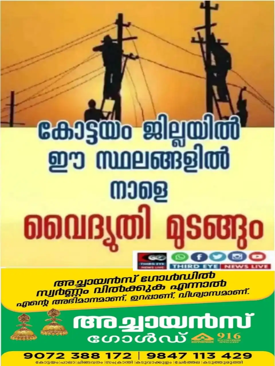 പൂഞ്ഞാർ ഇലക്ട്രിക്കൽ സെക്ഷന്റെ പരിധിയിൽ നാളെ (8-6-2024)H T ടച്ചിംഗ് വർക്ക് നടക്കുന്നതിനാൽ രാവിലെ 8.00 മണി മുതൽ വൈകിട്ട് 5.00 മണി വരെ വെട്ടിപറമ്പ് ട്രാൻസ്ഫോർമർ പരിധിയിൽ വരുന്ന സ്ഥലങ്ങളിൽ ഭാഗികമായി വൈദ്യുതി മുടങ്ങുന്നതാണ്.